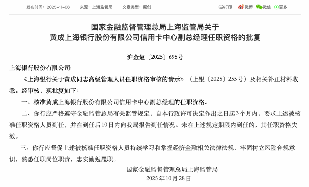 金融虎讯 11月7日消息,日前,国家金融监督管理总局上海监管局发布关于黄成上海银行股份有限公司信用卡中心副总经理任职资格的批复。据《上海银行关于黄成同志高级管理人员任职资格审核的请示》(上银〔2025〕255号)及相关补正材料收悉。经审核,核准黄成上海银行股份有限公司信用卡中心副总经理的任职资格。