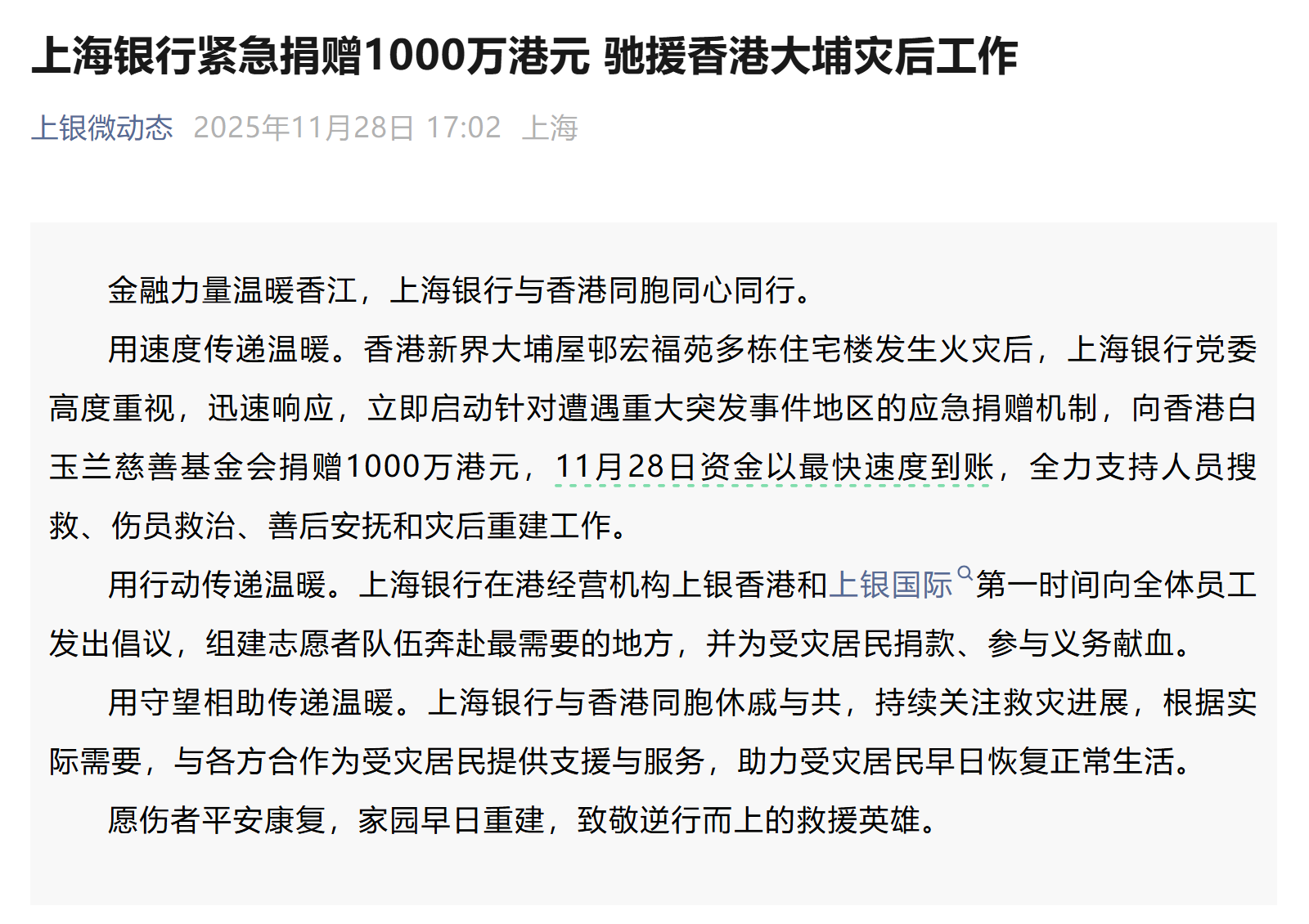 11月28日,记者从上海银行获悉,香港新界大埔屋邨宏福苑多栋住宅楼发生火灾后,上海银行党委高度重视,迅速响应,立即启动针对遭遇重大突发事件地区的应急捐赠机制,向香港白玉兰慈善基金会捐赠1000万港元。当日资金以最快速度到账,全力支持人员搜救、伤员救治、善后安抚和灾后重建工作。