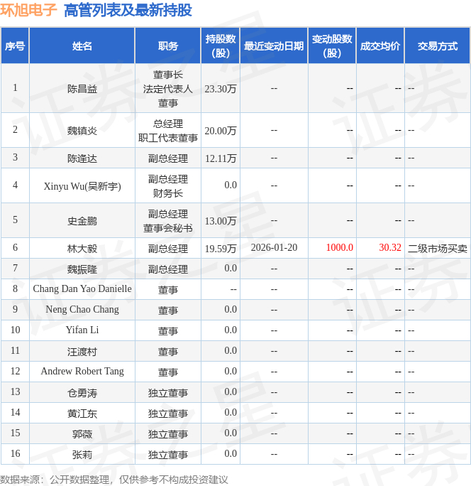 环旭电子的高管列表及最新持股情况如下: