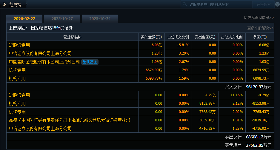 环旭电子(601231)今日涨9.97%,成交额38.46亿元,换手率3.78%,盘后龙虎榜数据显示,沪股通专用席位买入6.08亿元并卖出4.29亿元,2家机构专用席位净买入1.28亿元,有2家机构专用席位净卖出1.59亿元。