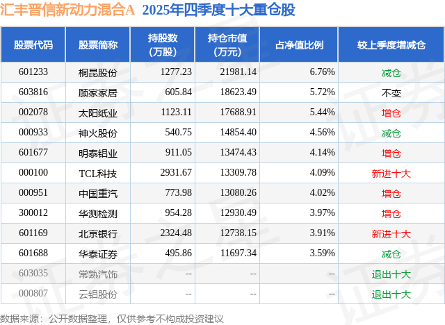 汇丰晋信新动力混合A的前十大重仓股如下:
