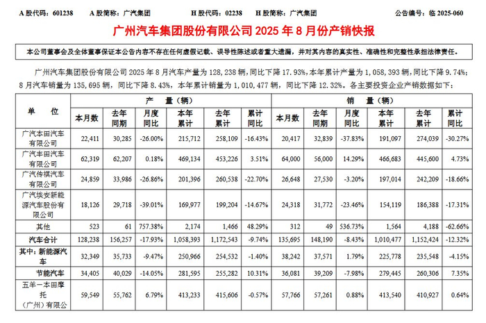 广汽集团在新能源赛道上所面临的挑战是无法忽视的。今年1-8月,广汽集团销量为101.05万辆,同比下降12.32%;旗下新能源品牌8月销量超2.4万辆,同比下降23.46%;前8月累计销量15.41万辆,同比下降17.31%。上半年,广汽集团营收为421.66亿元,同比下滑7.95%;归母净利润为-25.38亿元,同比下滑267.39%,经营状况面临严峻挑战。