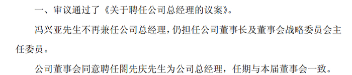 一为《关于聘任公司总经理的议案》,冯兴亚不再兼任广汽集团公司总经理,仍担任公司董事长及董事会战略委员会主任委员,广汽集团董事会同意聘任閤先庆为公司总经理,任期与本届董事会一致。