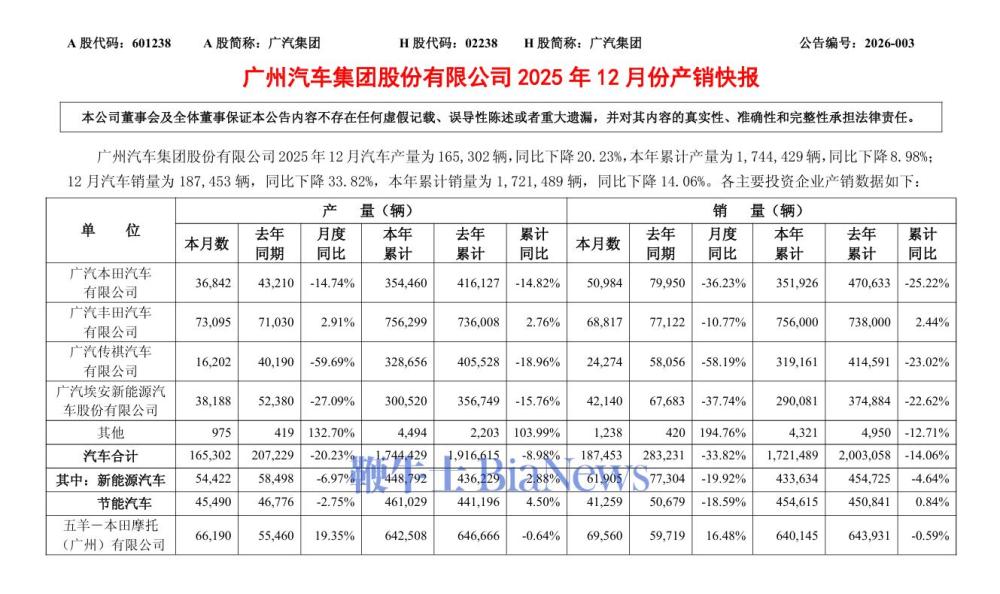 广汽集团发布2025年12月份产销快报:12月汽车产量为165,302辆,同比下降20.23%,2025年累计产量为1,744,429辆,同比下降8.98%;12月汽车销量为187,453辆,同比下降33.82%,2025年累计销量为1,721,489辆,同比下降14.06%。