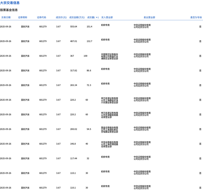 9月26日,英利汽车大宗交易成交849.5万股,成交额3117.67万元,占当日总成交额的9.86%,成交价3.67元,较市场收盘价4.31元折价14.85%。