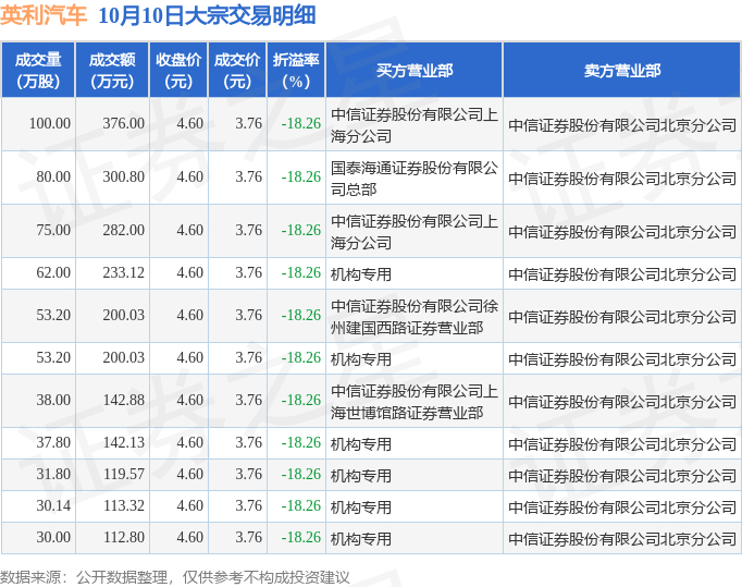 10月10日英利汽车现11笔折价18.26%的大宗交易 合计成交2222.68万元