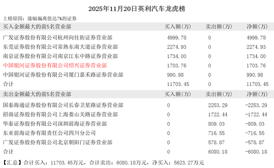 买入前5席为:广发证券股份有限公司杭州向往街证券营业部、东莞证券股份有限公司常熟东南大道证券营业部、南京证券股份有限公司南京江东中路证券营业部、中国银河证券股份有限公司绍兴证券营业部、中国银河证券股份有限公司厦门嘉禾路证券营业部。共计买入:11703.45万元,共计卖出:0万元。