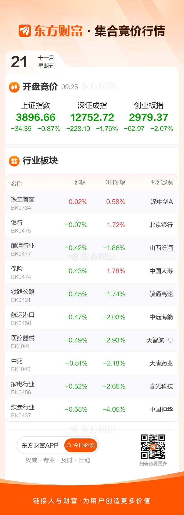 11月21日,三大指数集体低开,上证指数低开0.87%,深证成指低开1.76%,创业板指低开2.07%。板块方面,珠宝首饰开盘涨幅居前,深中华A涨10.01%。
