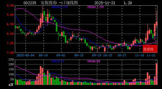 截止收盘,安妮股份报收8.62元/股,涨幅1.29%,成交量209万手,成交额18.21亿元,换手率37.82%。今日未涨停。