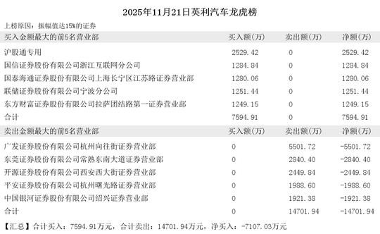 买入前5席为:沪股通专用、国信证券股份有限公司浙江互联网分公司、国泰海通证券股份有限公司上海长宁区江苏路证券营业部、联储证券股份有限公司宁波分公司、东方财富证券股份有限公司拉萨团结路第一证券营业部。共计买入:7594.91万元,共计卖出:0万元。