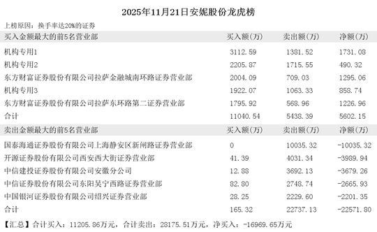 买入前5席为:机构专用1、机构专用2、东方财富证券股份有限公司拉萨金融城南环路证券营业部、机构专用3、东方财富证券股份有限公司拉萨东环路第二证券营业部。共计买入:11040.54万元,共计卖出:5438.39万元。