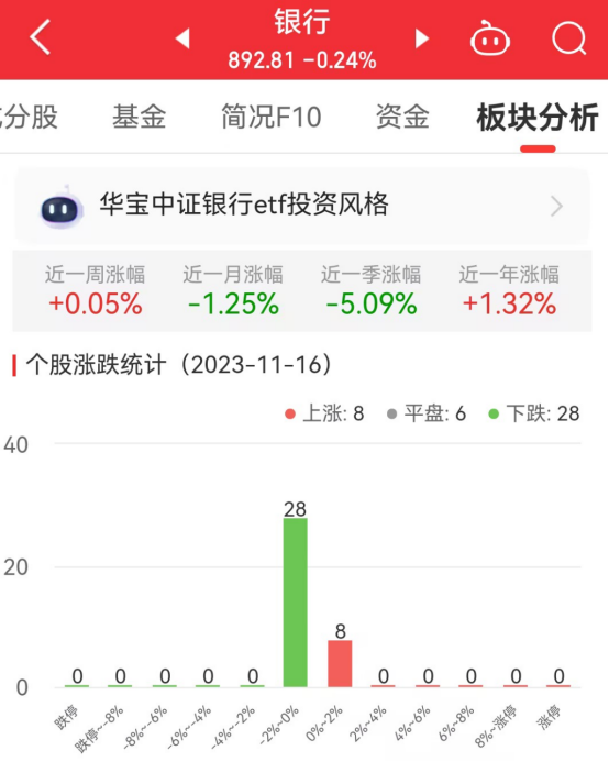 中国经济网北京11月16日讯今日,银行板块整体跌幅0.24%,其中8只股票上涨,6只股票平盘,28只股票下跌。