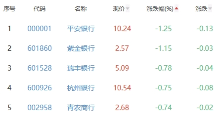 平安银行、紫金银行、瑞丰银行、杭州银行、青农商行位列涨幅榜后五位,涨幅分别为-1.25%、-1.15%、-0.78%、-0.75%、-0.74%。