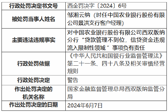 6月20日消息,中国农业银行股份有限公司西双版纳分行在贷款管理方面存在严重疏忽,导致信贷资金违规流入限制性领域,被国家金融监督管理总局西双版纳监管分局处以35万元罚款。同时,涉事银行的相关责任人,时任景洪支行副行长李芊及客户经理邹湘云纳,也受到了警告处罚。