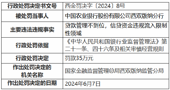 农业银行西双版纳分行被罚35万元:贷款管理不到位 信贷资金违规流入限制性领域