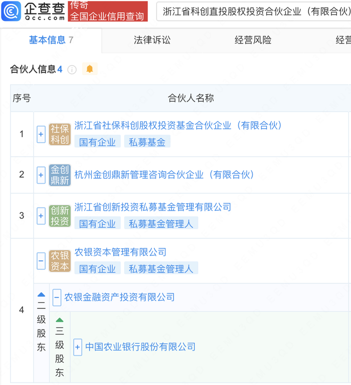 企查查APP显示,近日,浙江省科创直投股权投资合伙企业(有限合伙)成立,出资额约80.82亿元,经营范围包含:以私募基金从事股权投资、投资管理、资产管理等活动。企查查股权穿透显示,该企业由浙江省社保科创股权投资基金合伙企业(有限合伙)、农业银行(601288)全资子公司农银资本管理有限公司等共同出资。