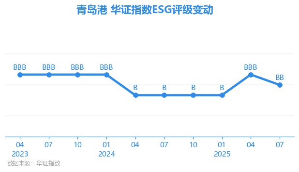 日前,华证指数公布了新一期(2025年7月31日)的ESG评级结果,青岛港(601298.SH)获得BB评级(华证指数评级为C起至AAA九档,C为最低档,AAA为其最高一级评级/AA为其第二档),上一期(2025年4月30日)ESG评级为BBB。本期ESG评级在45家交通基本设施行业A股上市公司中排名第22(上一期排名第16)。