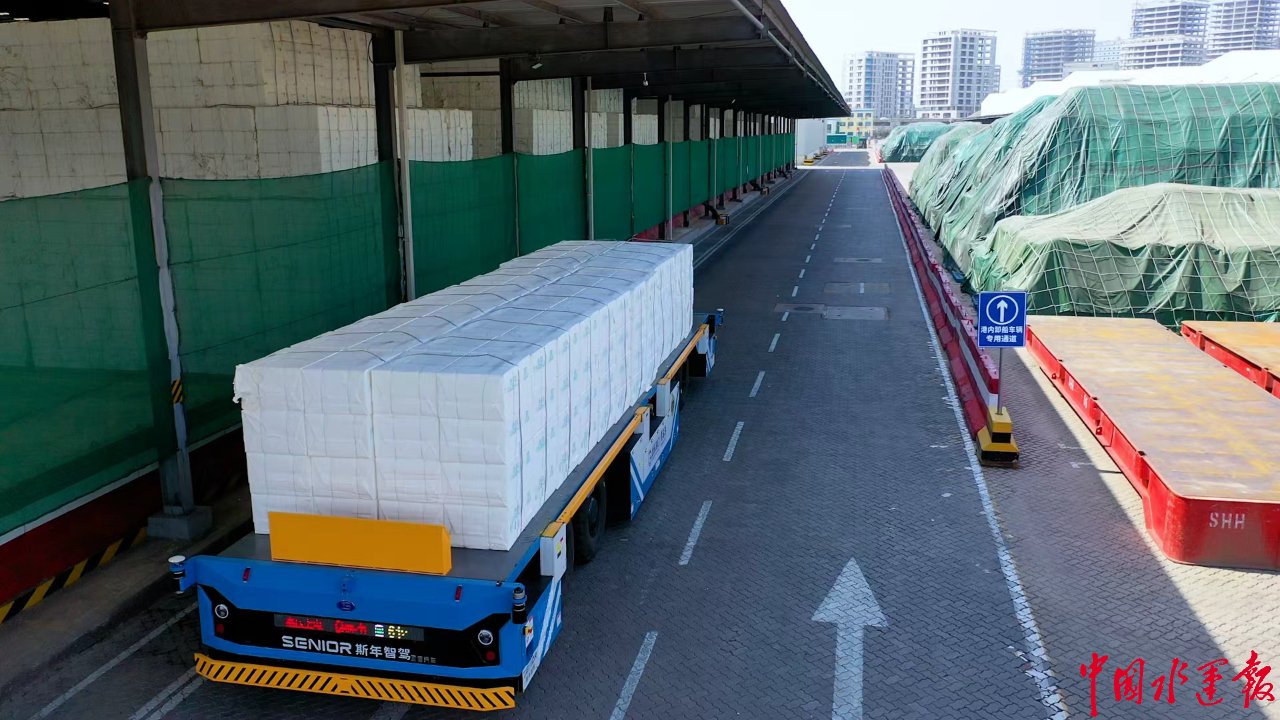 作为国内离岸壁最近、仓储能力最大的纸浆专用仓库群,青岛港建立市场、现场、库场协同联动机制,纸浆出舱后稳稳放置在IGV上,再转运入库,库内伸缩臂叉车将纸浆进行码垛,实现“装卸-转运-堆存”无缝衔接。