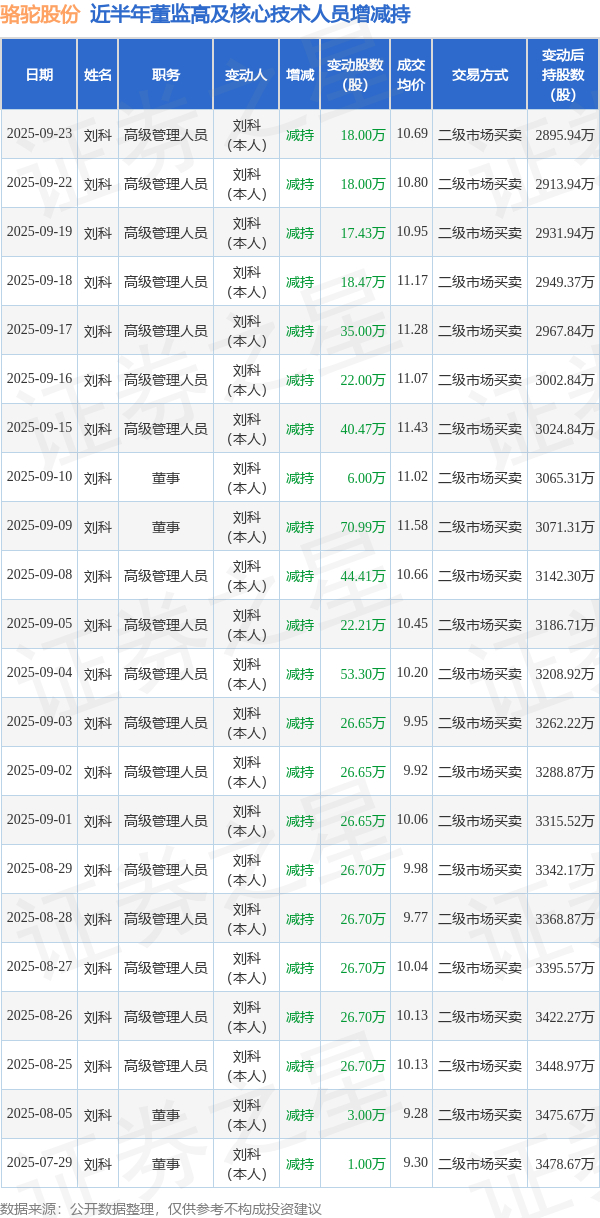 骆驼股份:9月18日至9月23日高管刘科减持股份合计71.9万股