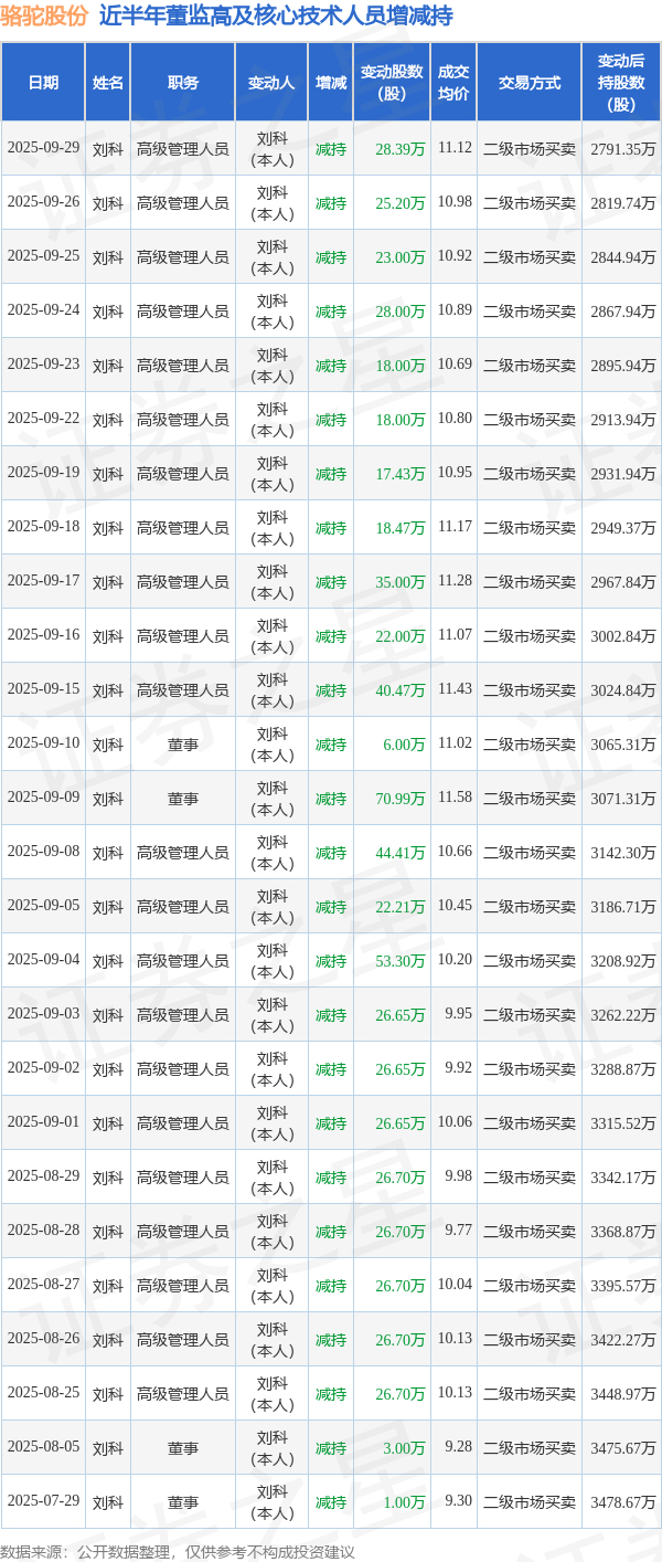 骆驼股份:9月29日高管刘科减持股份合计28.39万股