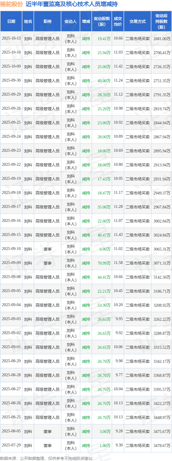 骆驼股份近半年内的董监高及核心技术人员增减持详情如下: