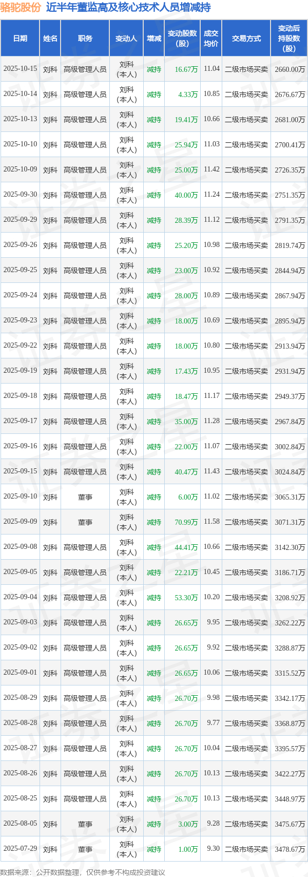 骆驼股份:10月15日高管刘科减持股份合计16.67万股