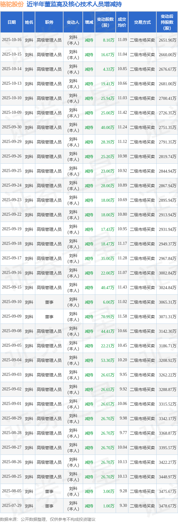 骆驼股份:10月16日高管刘科减持股份合计8.1万股