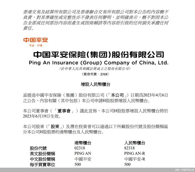 中国平安:H股股票增设人民币柜台将于6月19日生效