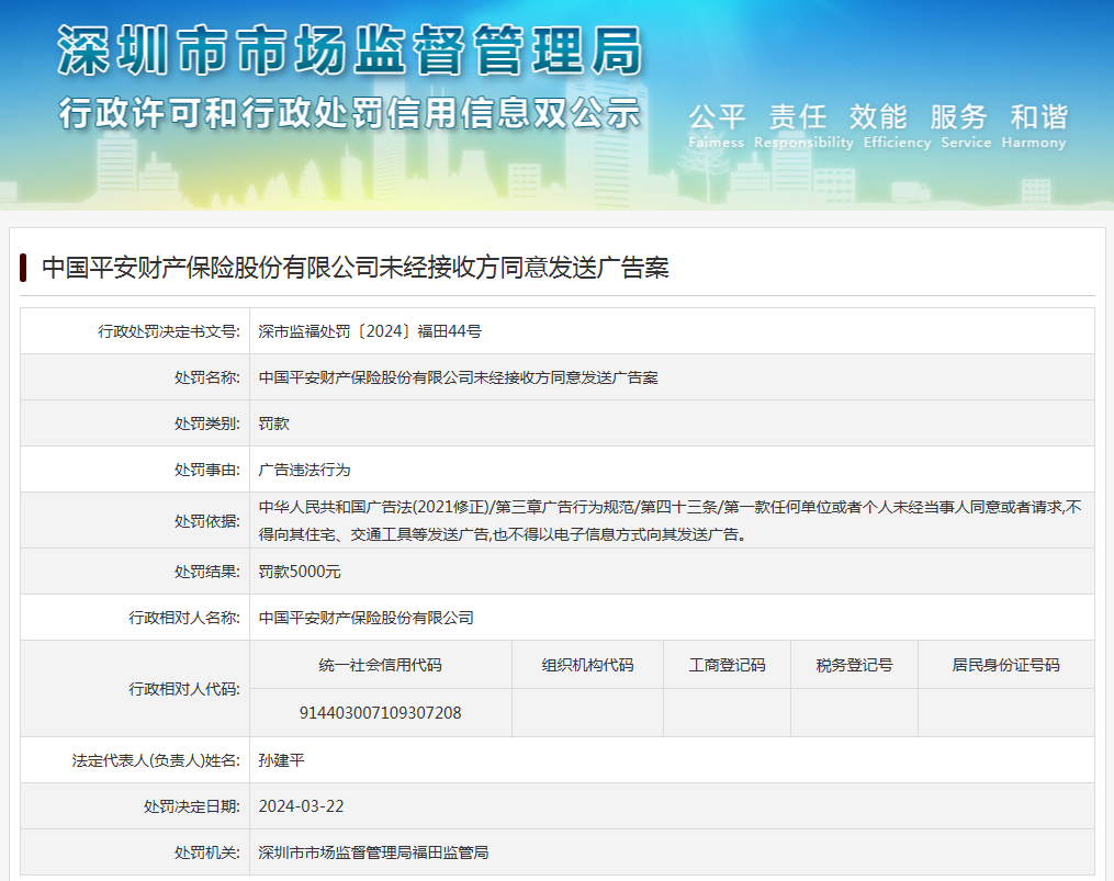 中国平安财产保险股份有限公司未经接收方同意发送广告案