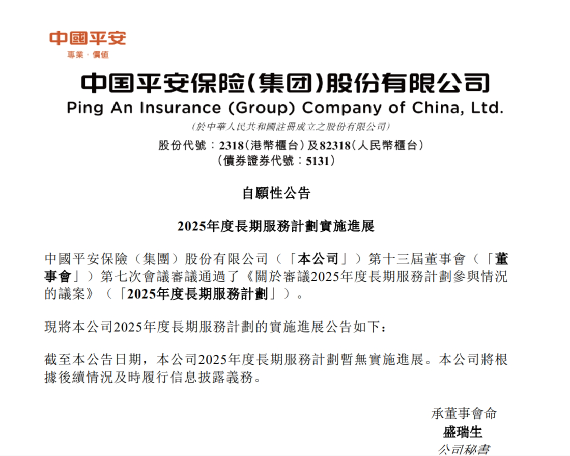 中国平安:2025年度长期服务计划暂无实施进展 将根据后续情况及时履行信息披露义