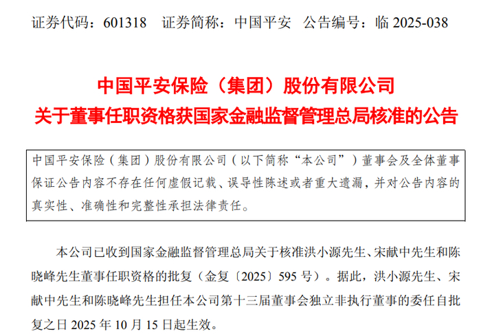 公告显示,中国平安已收到国家金融监督管理总局关于核准洪小源、宋献中和陈晓峰董事任职资格的批复(金复〔2025〕595 号)。自批复之日 2025 年 10 月 15 日起,洪小源、宋献中、陈晓峰担任公司第十三届董事会独立非执行董事的委任生效。同日,伍成业、储一昀和刘宏不再担任公司第十三届董事会独立非执行董事及其于董事会各专业委员会的相关任职。