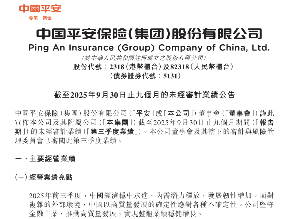 公告显示,截至2025年9月30日,中国平安归母净资产为9864.06亿元,分红后较年初仍增长6.2%,体现了资产负债表的韧性、稳健的盈利能力和可持续的分红能力。