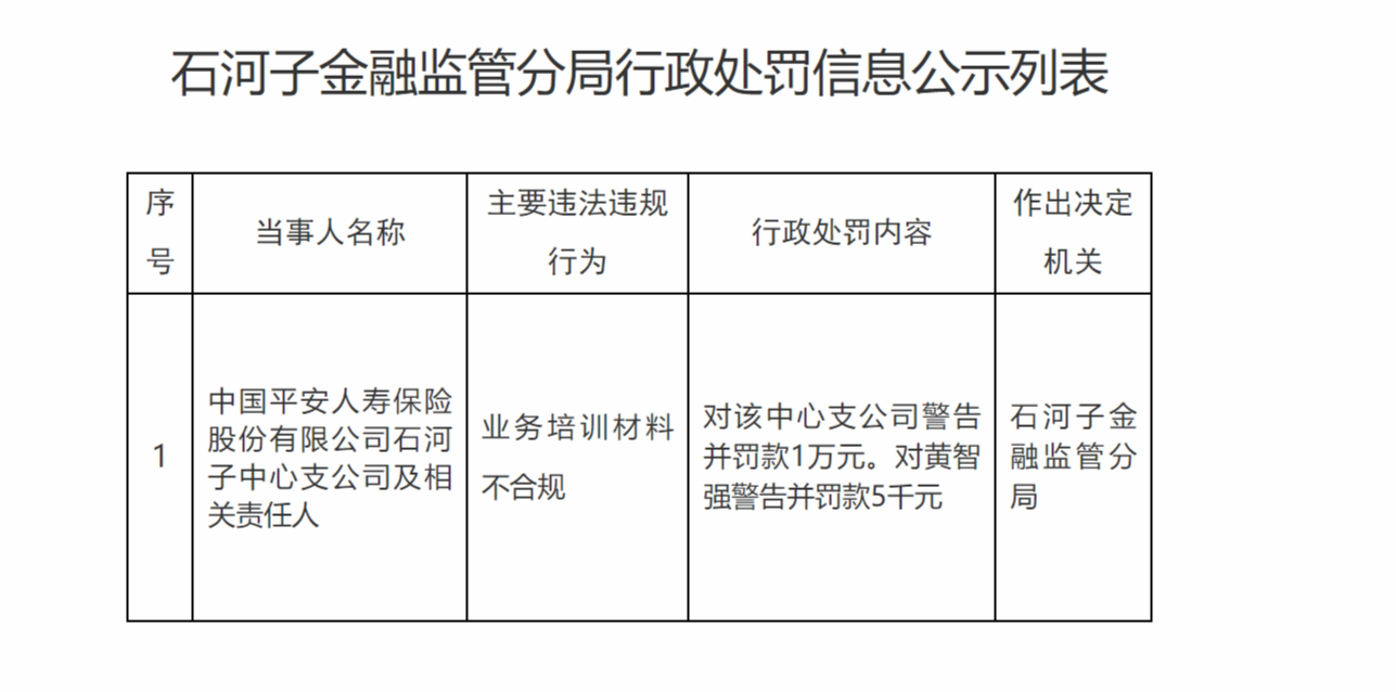 人寿保险股份有限公司石河子中心支公司,业务培训材料不合规,被警告并罚款1万元;相关责任人黄智强被警告并罚款5千元。