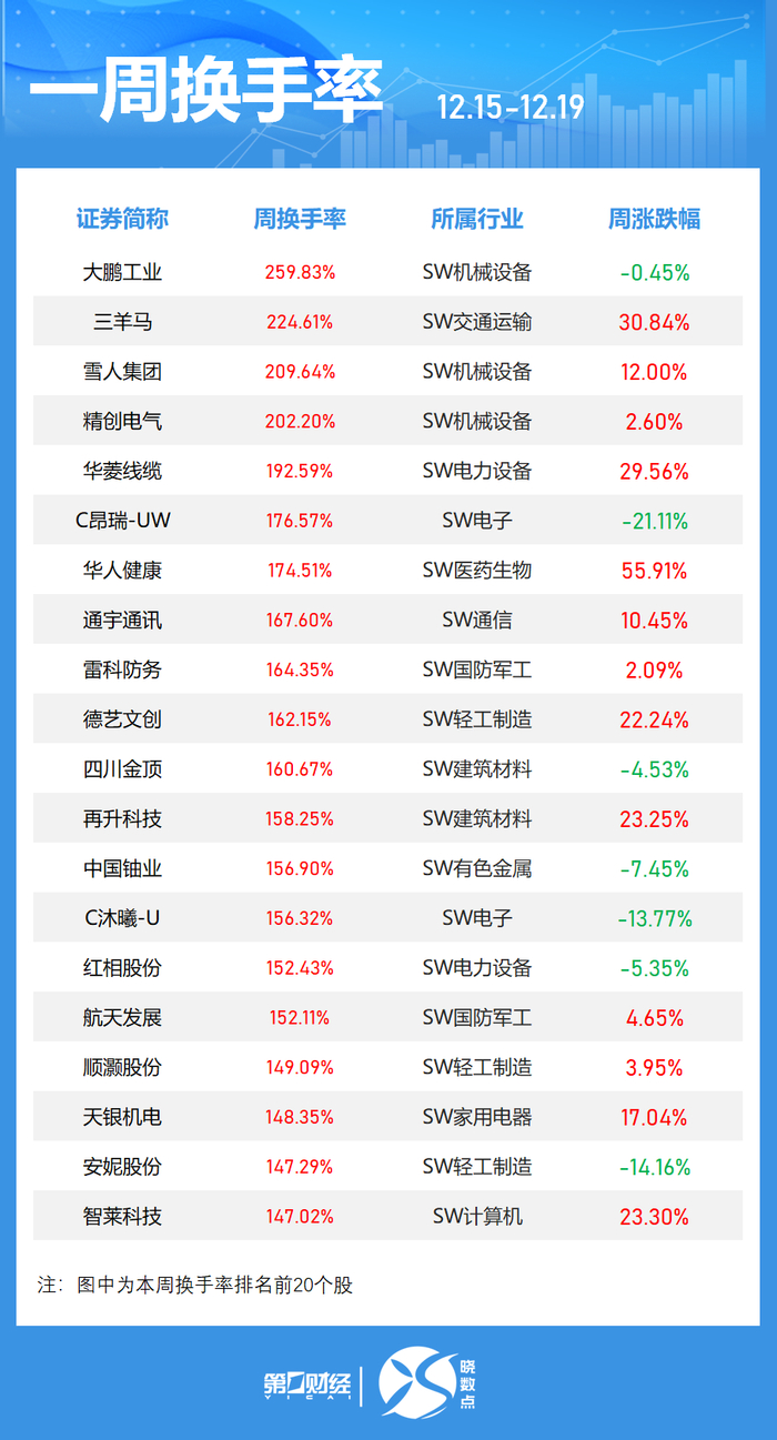 本周共有67只个股换手率超过100%。其中,大鹏工业排名居首,周换手率达到259.83%,三羊马周换手率224.61%,雪人集团周换手率209.64%。