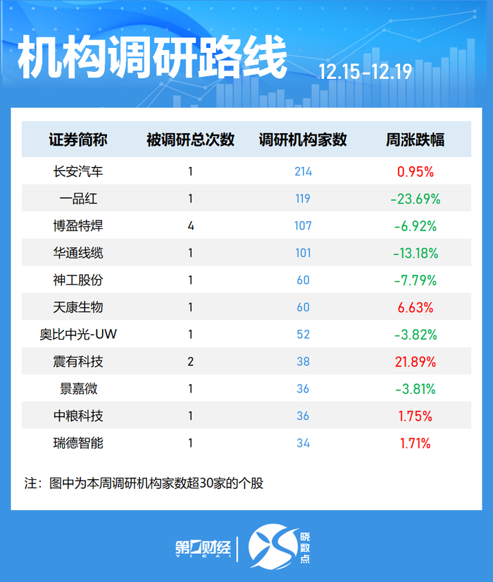 Wind数据显示,机构本周(12月15日至12月19日)共调研了165家上市公司,其中长安汽车最获关注,参与调研的机构均为214家。一品红、博盈特焊、华通线缆均获超百家机构调研。