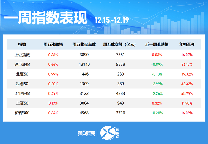 本周(12月15日至19日)A股三大指数涨跌不一,沪指涨0.03%,深成指跌0.89%,创业板指跌2.26%。