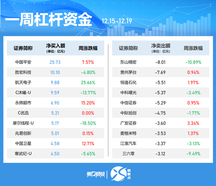 中国平安本周获融资净买入居首,净买入额为25.73亿元,周涨7.57%。胜宏科技、航天电子、C沐曦-U获净买入额居前;东山精密、贵州茅台、恒逸石化遭净卖出额居前,金额分别为8.01亿元、7.69亿元、5.51亿元。
