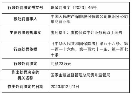 12月20日,国家金融监督管理总局贵州监管局行政处罚信息公开表显示,2023年12月11日,中国人民财产保险股份有限公司贵阳分公司车商营业部因虚列费用、虚构保险中介业务套取手续费,被处罚款23万元。