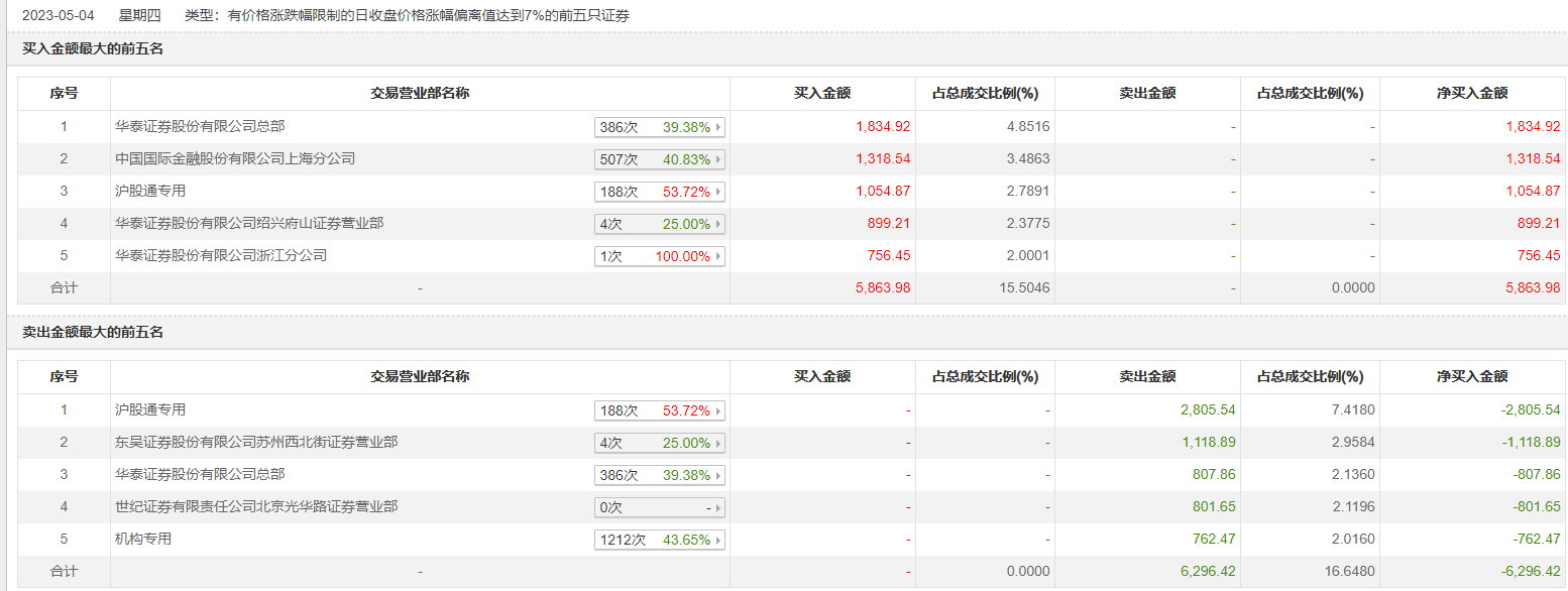 具体来看,机构合计净卖出762.47万元。此外,华泰证券总部、中国国际金融上海分公司分别买入1834.92万元、1318.54万元;沪股通专用、东吴证券苏州西北街证券营业部分别卖出2805.54万元、1118.89万元。