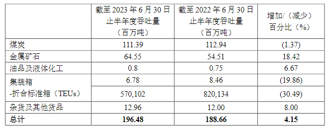7月10日公告,公司2023年上半年货物吞吐量总计19648万吨,同比增长4.15%。