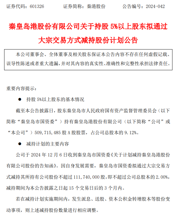 秦港股份(601326)12月8日晚间公告,持股9.12%的公司股东秦皇岛市国资委拟通过大宗交易方式减持其所持有公司股份不超过1.12亿股,即不超过公司总股本的2%,减持期间为15个交易日后的3个月内。