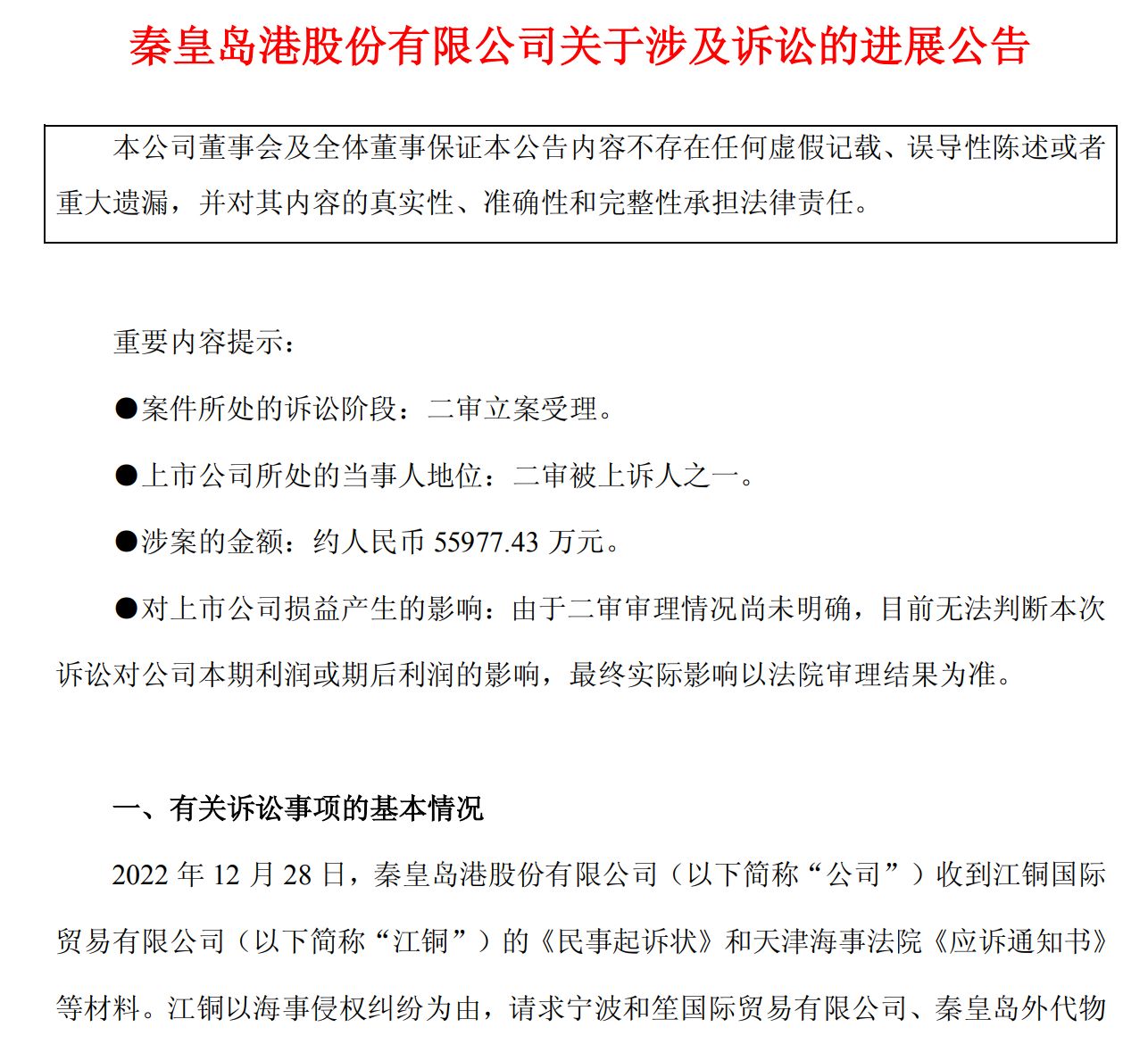 再遭5.6亿元索赔上诉!秦港股份铜精矿“失踪”案纠纷未了