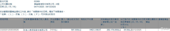 格隆汇12月4日丨根据联交所最新权益披露资料显示,2025年12月2日,秦港股份(03369.HK)获长城人寿保险股份有限公司在场内以每股均价2.6637港元增持59.75万股,涉资约159.2万港元。