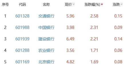 其中,交通银行、中国银行、建设银行、农业银行、北京银行位列板块涨幅前五位,涨幅分别为2.58%、2.31%、2.21%、1.71%、1.69%。