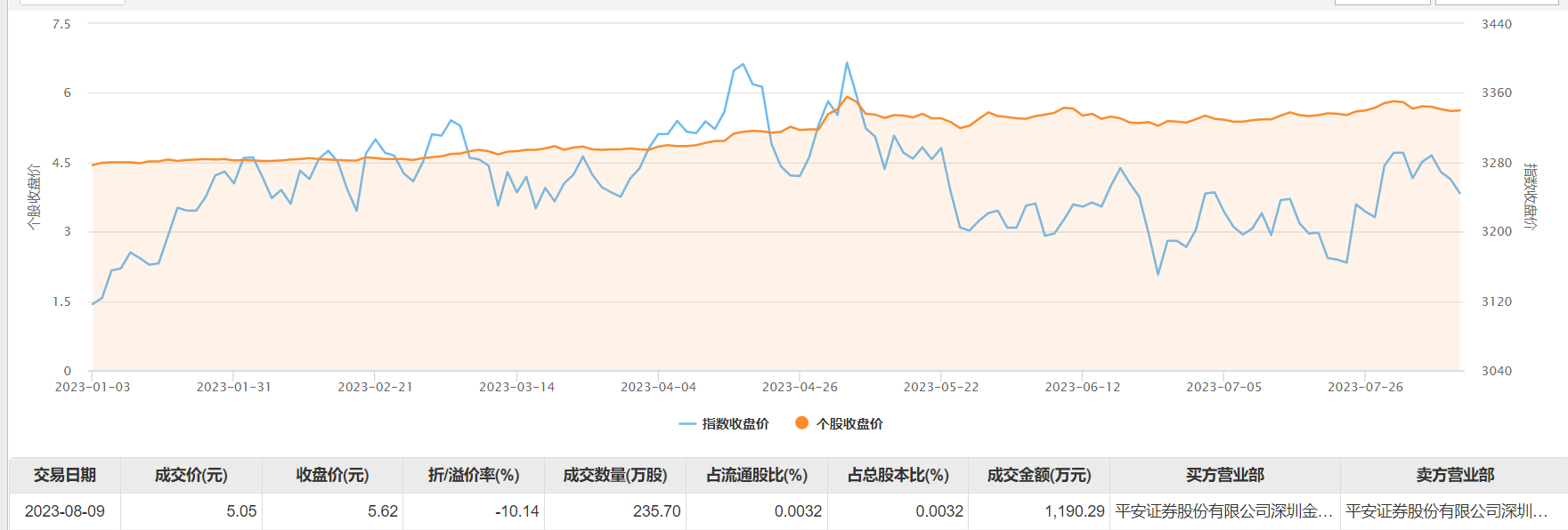 8月9日大宗交易成交235.7万股,成交额1190.29万元,占当日总成交额的3.6%,成交价5.05元,较市场收盘价5.62元折价10.14%。