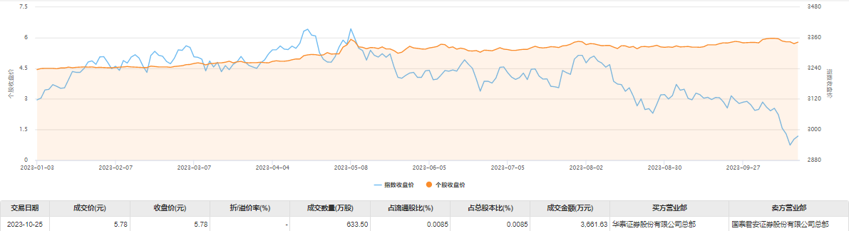 今日大宗交易成交633.5万股,成交额3661.63万元,占当日总成交额的7.74%,成交价5.78元,较市场收盘价持平。