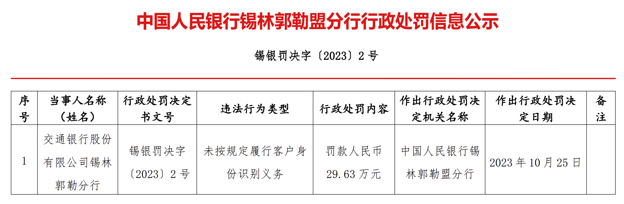 交通银行锡林郭勒分行被罚29.63万:未按规定履行客户身份识别义务