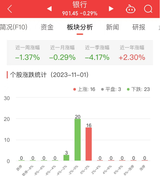 中国经济网北京11月1日讯今日,银行板块整体跌幅0.29%,其中16只股票上涨,3只股票平盘,23只股票下跌。