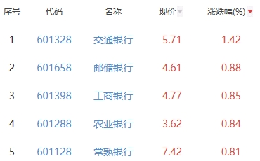 其中,交通银行、邮储银行、工商银行、农业银行、常熟银行位列板块涨幅前五位,涨幅分别为1.42%、0.88%、0.85%、0.84%、0.81%。