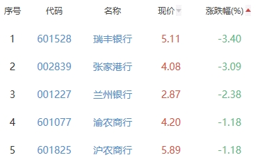 瑞丰银行、张家港行、兰州银行、渝农商行、沪农商行位列涨幅榜后五位,涨幅分别为-3.40%、-3.09%、-2.38%、-1.18%、-1.18%。